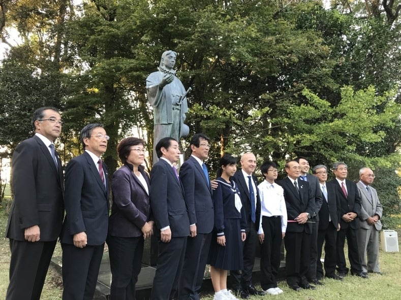 (写真:イタリア大使と伊東満所(マンショ)像を前に記念撮影)