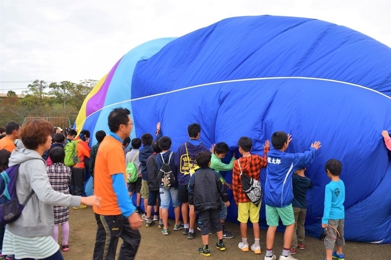 準備が終わり、最初に校長先生と数名の児童の乗ったバスケットが浮き上がった時、一斉に会場から歓声と拍手が!児童たちは、「海が見えます!」「校舎が小さくみえます!」と大はしゃぎ!下りてきてからも興奮おさまらずといった感じです。そして次々に児童、先生、保護者、地域のみなさんが搭乗体験を行い、気づくと全員が搭乗し、会場が笑顔に包まれた第1回の搭乗体験は無事に終了しました。