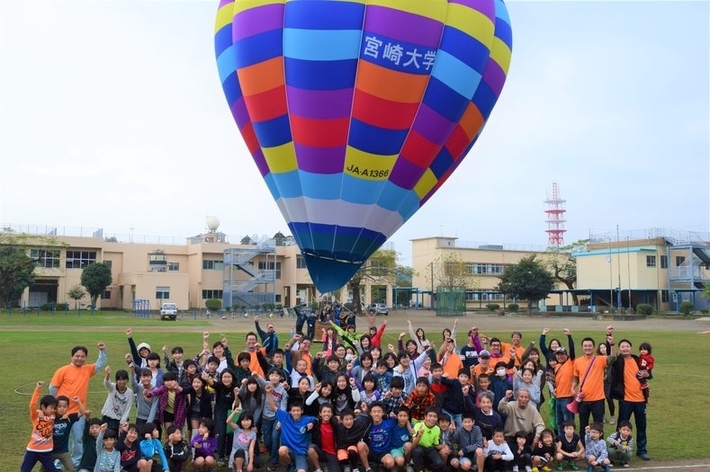 宮大チャレンジプログラムとは、将来、社会でリーダーとして活躍する宮大生の企画する力や実施する力を高めるために大学が全面的にバックアップしているプログラムで、多くの学生がこのプログラムを利用してさまざまな地域貢献や社会貢献をおこなっています。そして宮崎大学気球部は子どもたちに熱気球の飛ぶ原理の実験や授業を通じて空を飛ぶことの楽しさを伝えています。
