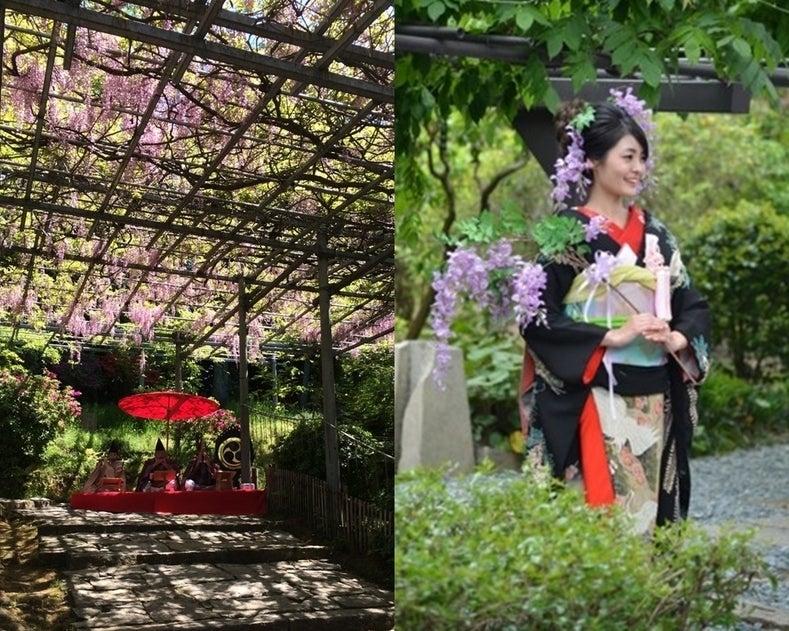 ▲「阿知の藤」の下で行われている「藤まつり」の様子と「初代くらしき藤娘」