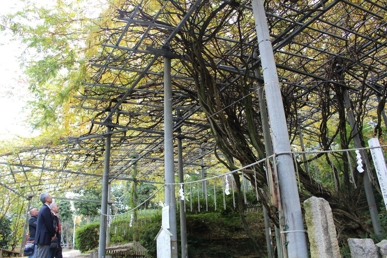 かつては、ゴールデンウィークの時期になると、藤棚全面に淡紅色の花を咲かせ、趣深い姿を見せてくれていましたが、最近は老木のためか花数が減少し、一時は蔓が腐る等枯死寸前に陥るほど樹勢が衰えた時期もありました。