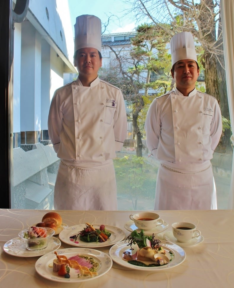 ▲「藤棚ペアーランチ」を作った王野シェフ(左)と内藤パティシエ(右)