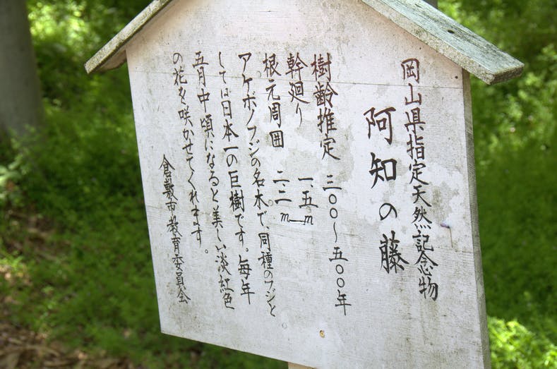 倉敷美観地区の北にある鶴形山公園の阿智神社境内にある「阿知の藤」は、樹齢500年ともいわれ岡山県天然記念物にも指定されています。