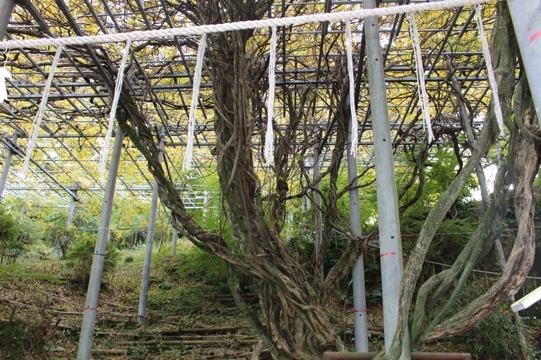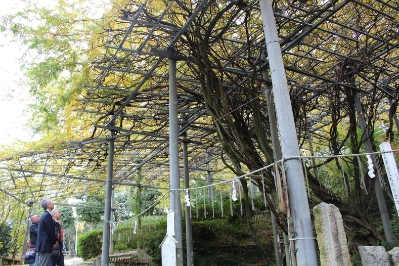 幹回りが約1.5m、根元周囲は約2.2mもあり、アケボノフジと呼ばれる品種のフジとしては、日本国内最古かつ最大といわれています。