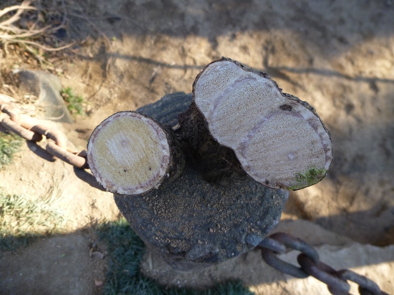 1月9日から本格的に「阿知の藤」の保護対策が始まりました。 11日(木)から造園業者による剪定が始まり、12日(金)には樹木医の塚本先生が様子を見に来ると聞いたので、阿智神社へ行ってきました。 お伺いした12日(金)は、根を活性化するために新しい土が入り土壌改良が始まっていました。また、締め付けあい養分が十分に行き渡っていない状況を解消するため、藤蔓の剪定、切除作業も行われていました。 塚本先生からは、伐採した藤の枝を切って見せていただきました。切断面には年輪のような層が形成されており、「多重形成層」と教えていただきました。(上写真:右側が多重形成層)よく目にする同心円状の年輪とは違い、枝では樹齢を重ねるに従い、一方向に片寄った形で層が形成されていくそうです。 造園業者の方たちも熱心に聞いていました。 塚本先生から最終的には、8メートルある藤棚も改修され、全体のボリュームが今よりもかなり小さくなるというお話でした。倉敷市を代表するシンボル「阿知の藤」の今の姿を見ることができるのは、あと少しとなりそうです。 こういう機会はなかなか無いと思いますので、ぜひ一度、「阿知の藤」の様子を見に行ってみてください。