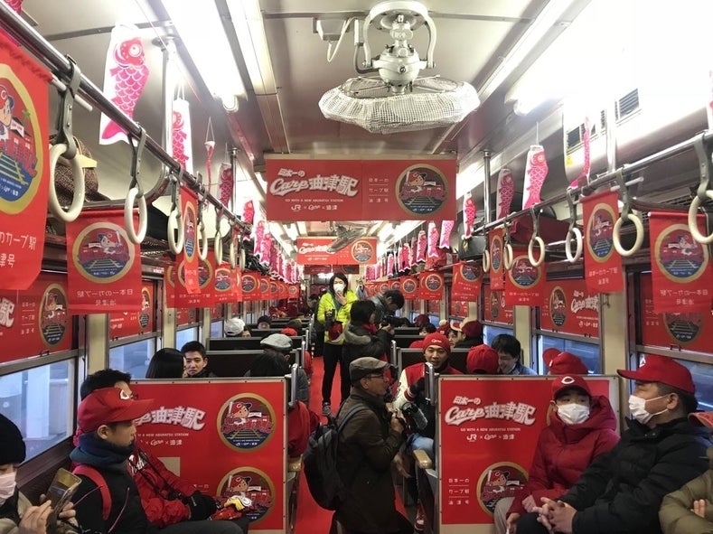 さらに、このセレモニーに合わせて運行された幻のチャーター便「日本一のカープ"油津"号」の列車内も大いに盛り上がりました!日南線を走るキハ車両の中が真っ赤っ赤。。。