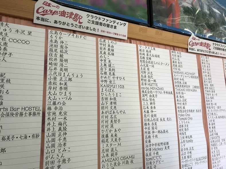カープ油津駅舎の中にはクラウドファンディングでご支援いただいた方のリストをさっそく掲示させていただいております! クラウドファンディングの締め切りの2月15日までにご支援いただければ、3月31日を目処に新たにお名前を追記させていただきますので、まだまだご支援お待ちしております!