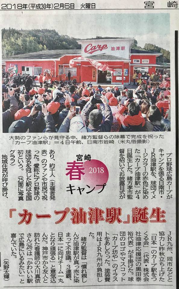 12月4日からスタートしてきましたクラウドファンディングは一昨日の15日を持ちまして受付終了となりました! 200万円だった目標を大きく上回る303万8千円が集まり、合計で324名の方からご支援をいただくことができました。 目標金額を上回った資金に関しては現在実行委員会で協議中ではありますが、カープ油津駅の維持管理費や、カープ油津駅を訪れたファンの方により楽しんでいただけるための環境整備のために使わせていただきたいと思います。具体的な使途が決まりましたら、コチラのレポートで追って御連絡させていただきます。 思い起こせば記者発表は12月4日でした。当時は普通の油津駅の駅舎内に即席の机を置いて日南市長を顧問に招き行いました。宮崎県内のメディアはもちろん、広島のテレビ局でも放送していただき、大きな反響をいただきました。 そして、年をまたいで、1月13(土)、14日(日)には市民やファンと一緒に油津駅にメッセージを書き、それをカープレッドで塗り込めるイベントを開催いたしました。2日間で合わせて100名の方にお越しいただき、カープへの応援メッセージや2018年の個人的な目標、JRに乗ろう!といった色とりどりのメッセージが駅舎の壁面にびっしりと並びました。 それをまた市民・ファンの手によってカープレッドで塗り込め、封じられることで、駅舎の中に永遠に刻まれることになりました。真っ赤に染まった現在のカープ油津駅の中にはいまでも皆さんのメッセージが生き続けています。 そして、2月4日のオープニングセレモニー。9時10分からという朝早い時間にもかかわらず、想定の400名を大きく超える約1,000名の方がカープ油津駅のお披露目セレモニーにお越しいただきました。宮崎駅からセレモニーに合わせて運行された「日本一のカープ駅”油津”号」はクラウドファンディングでご支援いただいた方約60名にご乗車いただき、特製のヘッドマークと行き先案内板を掲げ、内装も全面カープ仕様。途中の青島駅ではカープ芸人としても有名なザ・ギースの尾関さんも乗り込んで来られたときには列車内は大盛り上がりでした! そして列車は日南市内に入り、北郷駅からは地元住民の方が手を列車に手を振ってくれました。 そして、列車がカープ油津駅に到着すると、お披露目セレモニーがスタート。 実行委員会の日本一のカープ駅をつくる会の黒田代表、宮野原代表、顧問の﨑田日南市長が挨拶したあとは、お待ちかねの緒方監督による塗り収め式、駅舎の除幕式を行い、緒方監督からのメッセージをいただきました。「慣れ親しんだ町が真っ赤になっていくことが不思議な感じがします。」とコメントを頂きながらも、商店街や油津カープ館にも足を運んでください、とご紹介頂きました!そして最後は日本一に向けて頑張っていくと力強く決意を頂きました。 もちろんカープ油津駅は一時的なものではなく、これからも赤く残り続けます。それはカープが市民に愛される球団であることの象徴でもあります。今年で56年目になった広島カープの日南春季キャンプですが、これからもずっと日南キャンプで選手たちを応援できることを楽しみにしています! 筆末ながら、今回ご支援いただいた皆様、そして色んな形で関わっていただいた皆様、カープ油津駅を訪れていただいたファンの皆様、本当に有難うございました!本当に皆様のご協力無しには成り立たなかったプロジェクトでした。 また、別のプロジェクトでお会い出来ることを楽しみにしております!
