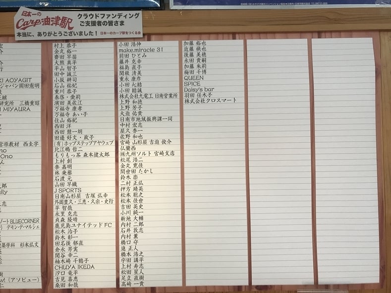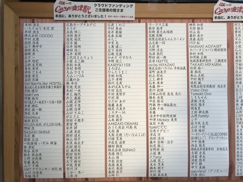 さて、2月4日のセレモニーに合わせて、カープ油津駅ではクラウドファンディングFAAVOでご支援いただいた方のお名前を掲示させていただきました。今回は時間の都合上、1月31日までにご支援いただいた方のみの掲示となってしまいましたが、2月1日以降にご支援いただいた方はクラウドファンディングが終了する2月15日以降に芳名板を制作し、掲示させていただきます。
