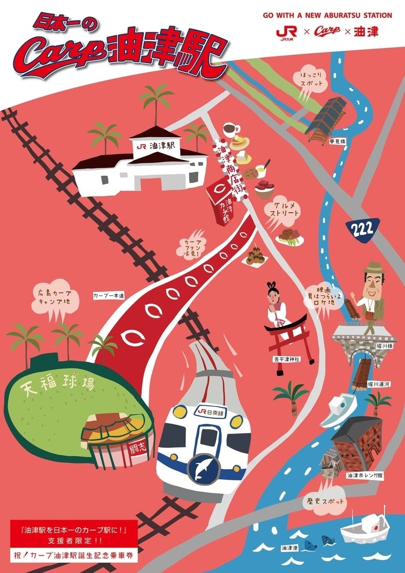上記のコースにご支援していただいた方だけが手に入れることの出来る記念台紙は、油津駅や油津商店街、堀川運河、赤レンガ館など、カープの選手たちも過ごしてきた、油津の街並みが描かれており、とても暖かみのあるデザインになっています。