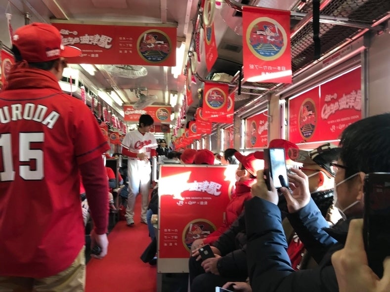 さらに、このセレモニーに合わせて運行された幻のチャーター便「日本一のカープ"油津"号」の列車内も大いに盛り上がりました!日南線を走るキハ車両の中が真っ赤っ赤。。。