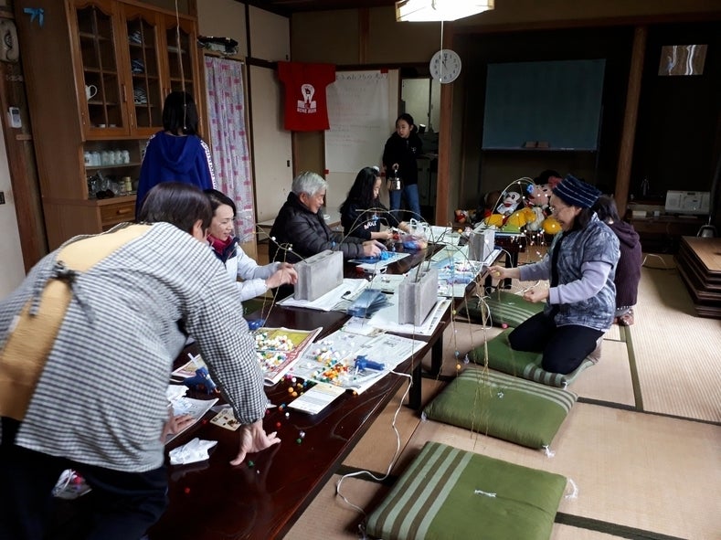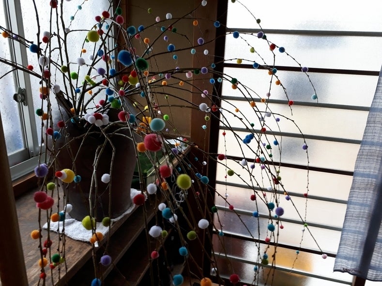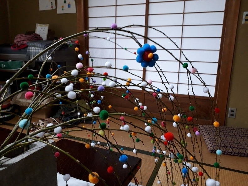 さて今日城東では子どもとじいちゃん、ばあちゃんが集まって雛めぐりに向けて餅花作りをしました。