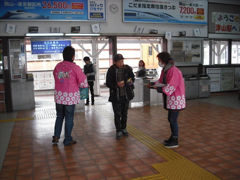 津山城下町雛めぐり のメンバーは毎年JRでおこしのお客様をおもてなしする為に イベントの開始時間、津山線の到着時間に合わせて駅でのお出迎えを行っています。
