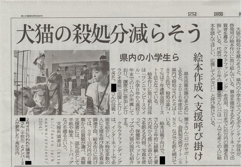 先日の譲渡会で四国新聞さんに取材していただき、3/2号に記事が掲載されました。 譲渡会に参加して感じたことがあります。 譲渡会に参加しないとわからなかったことがあります。 譲渡会で、人におびえる犬猫を見て驚きました。 譲渡会には毎回20~30匹の犬猫が参加しています。 ですが、なかなか里親さんが見つからず、いつも同じ犬猫が参加しています。 なので、皆さんに譲渡会に足を運んでほしい! 譲渡会で、保護されている犬猫の里親さんになってください! たくさんの犬や猫が里親さんになってくれる人を待っています。 3/3現在、皆様のおかげで、429,000円(53%)を達成しています。 残すところ20日、目標の800,000円を達成するために頑張りますので、皆様の応援よろしくお願いします!!
