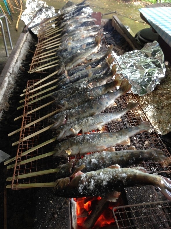 ▲夏のヤマメ祭り風景、釣り上げたヤマメの炭火塩焼は格別です。