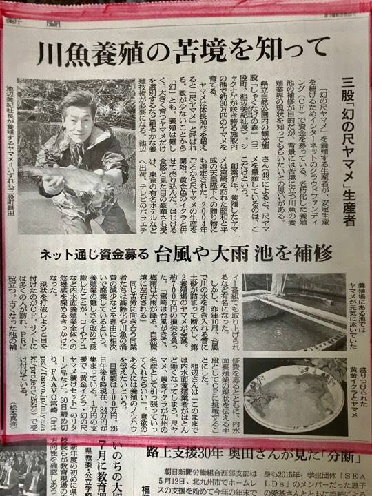 思いを伝え続け、一人でもがき苦しむ時もありましたが、残すところわずか3日。ここに来て皆様の温かい応援で凄いことになってます。 FAAVOのトップページのトップである「注目プロジェクト」に掲載されました。これはいいね!や、シェアが多いほど、上位にランクされ、全国でもっとも多いものが注目プロジェクトとして掲載されるとのことです。 多数の起案の中で、トップはかなり難しいとのこと。応援いただいております、全ての方々に感謝!感謝!です。 ここ数日感謝!感激!の毎日になっております。 そして、なんと!新聞記事にもなりました。 ヤマメ養殖は自然と対峙するなりわいで、それだけにリスクも高い仕事です。さらに尺ヤマメの量産ともなると、かなりの困難があります。だから、全国でもしゃくなげの森でしか、やってないわけです。 また、内水面養殖のコイやアユの業者も高齢化や消費量の減少、エサ代などの値上げで廃業が相次いでいます。だからこそクラウドファンディングを通して、内水面漁業の厳しい現状を知ってほしいと思いますし、尺ヤマメ生産と黄金イクラが九州の特産として内水面漁業の光であればと思います。 残りわずかの日数で、少々焦りと緊張もありますが、応援してくださる方々の思いをエネルギーにして、最後まで頑張ってまいります。