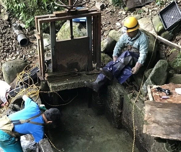 ▲昨年の台風で砂利で詰まった導入管の除去作業風景