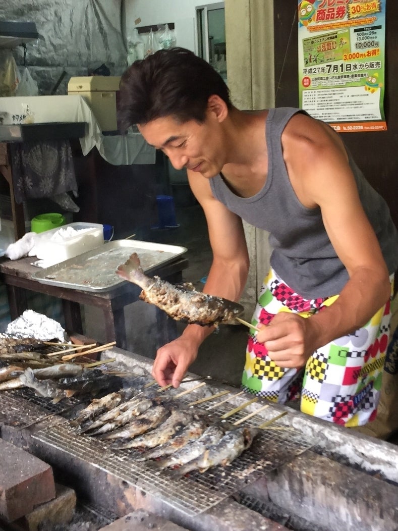 ▲夏のヤマメ祭り風景、釣り上げたヤマメの炭火塩焼は格別です。