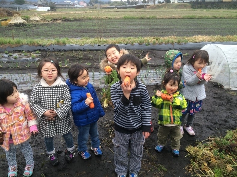 ▲無農薬の西田農園で堀りたてのにんじんにかじりつく子どもたち