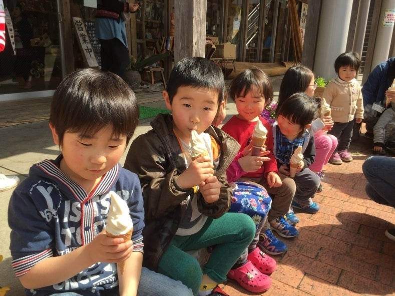 ▲ぽかぽか陽気の平和台公園でアイスクリームを頬張る子供たち