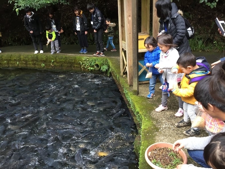 ▲日本で一番おいしい鯉料理がお店で食べられる泉の鯉に餌やり