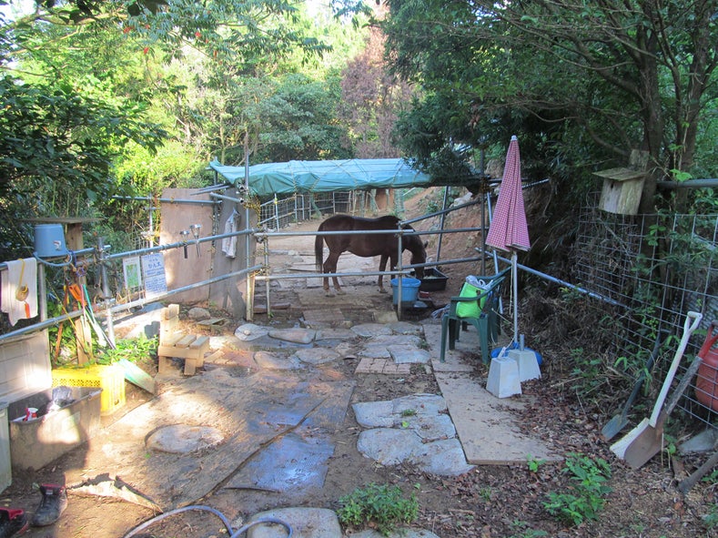 旧放牧地の片づけ作業がやっと完了しました。 とにかくこの場所は、土の質が粘土質で、その改良と対策に 苦しみました。 ひん太が歩くだけで、まるで泥沼のようになってしまうので 砂・まさ土・枯葉・おがくずなどを入れましたが、焼け石に水 でした。 次に古畳やコンパネ、コンクリート平板などを重ねて敷いて やっとくい止めるという感じ。 撤去となると、それらを可燃物、不燃物、採石場などと分けて 処理しないといけないので、これが想像を越える難作業でした。 この場所に1年と10ヶ月間、ほぼ毎日通いました。 やはり最終的に去るとなると、感慨深いものがありました。 特に隣接する他施設の所有する馬の中には、最後の最後まで 長崎市の坂道で荷運びをしていた馬がいたので、 もうその馬を見ることも当分無いと思うと寂しさもひとしお でした・・・