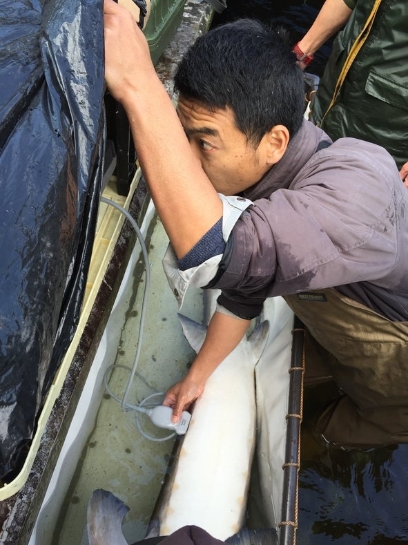 2018/03/28 10:54抱卵した魚はさらに個別の水槽に分けられます 抱卵までの育成で臭みのない魚を作りさらにここから出荷までの間に特別な飼料を使うことによってさらに臭みのない魚を目指し養殖していきます ここで重要なのは卵の熟成度合いを細かくチェックすることです 当社の養殖池は川の水を使いかけ流しなので水温が他社の池よりも低く年間平均9℃~12℃となっております 養殖に関してこの水温はデメリットも多く成長が遅くなる分魚の太りが悪かったり抱卵時期が遅かったりします しかしキャビアの養殖に関していうと抱卵から熟成までの見極めが大事な要素となっているので完全に熟成する時期を狙えるという意味で他社ではできないお腹の中での完全熟成がしやすいというメリットがあります 抱卵を確認した魚体は卵の卵形を検査し3m以上になるのを待ちます ここが難しく水温や個体差により熟成する速さが違い最高のタイミングを見計らうため何度も少量の採卵をし検査を行います このように水産試験場に協力していただきエコーを使い抱卵検査を行い、 特殊器具を使い採卵し熟度検査を行います 何度も検査しようやく初めて熟成しきったキャビアができた時の達成感はなににも代えがたいものがありました そうして8年の歳月を経てようやく熟したキャビアは加工され宮崎HINATAキャビアとして皆様の元へ届けられるようになります もっと見る