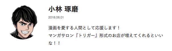 正直なところ、トリガーの発起人の小林さん、兎来さんたちの足元にも及びませんが、情熱だけは負けないように張り切っています。作品との出逢いもですが、もっともっと岡山のエンタメを盛り上げたい、マンガ業界に貢献したい。そんな風に考えています。