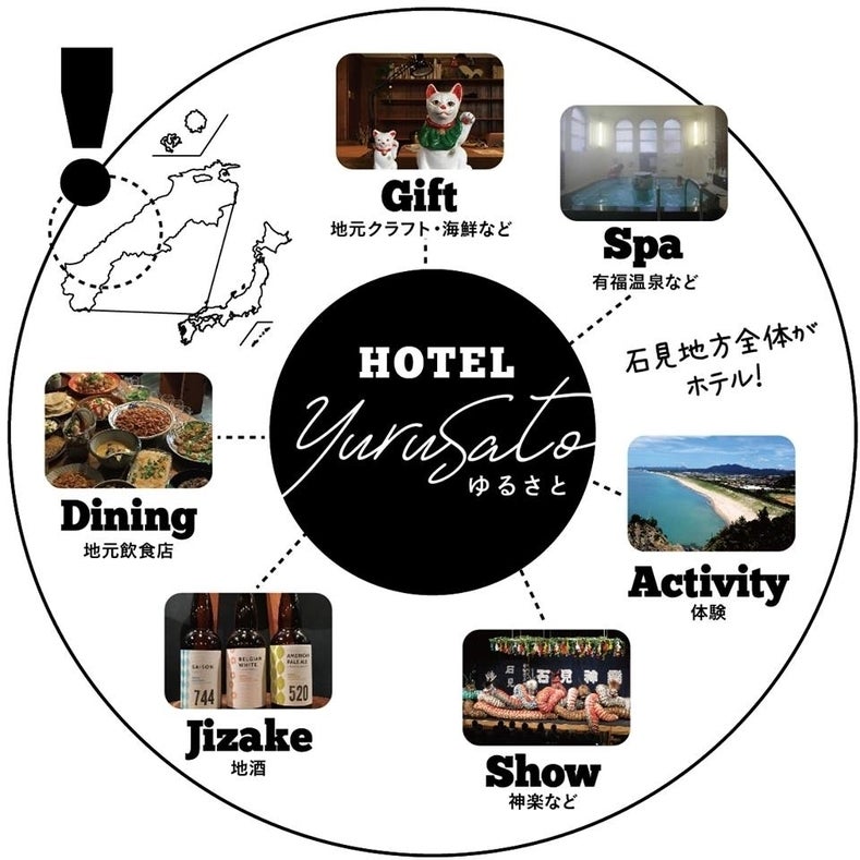 石見地方(島根県西部)を一つのホテルに見立てて、まちぐるみでおもてなしできたらいいなと考えました。石見地方には観光客が一日中滞在できる大きな旅館やホテルはありません。ただ、地域の人が通うおいしい飲食店や、美肌効果抜群の温泉に加えて、海や山で体験できるアクティビティ、お土産に買って帰ると必ず喜ばれる素敵なクラフトの品々や日本海の幸など、ネタにつきません。食堂、大浴場にお土産売り場・・・Yurusatoがフロントと宿泊を担えば・・・一つの大きなホテルと見立てることができます。みんなが集まれば、訪れてくださった方々にもきっと満足していただけるおもてなしができると思います。何より、まち全体、地域全体がホテルなんて楽しそう。