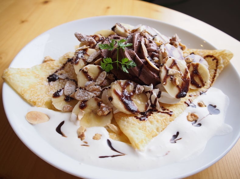 ▲一番人気のチョコバナナクレープ。オリジナルの米粉配合生地と濃厚生クリーム&カスタードソースの組み合わせをぜひお試しください!アイスはプレミアムソフトクリームを使用しています。