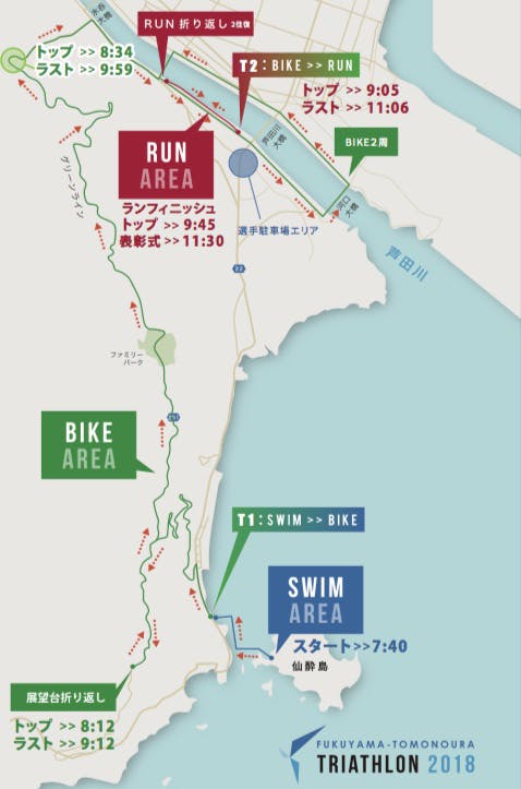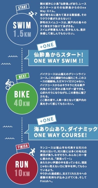 人気のパワースポット「仙酔島」のスイムスタートから、本土に渡っての絶景バイクコース、福山市の母なる川「芦田川」を望みながらフィニッシュへと向かうランコース。
