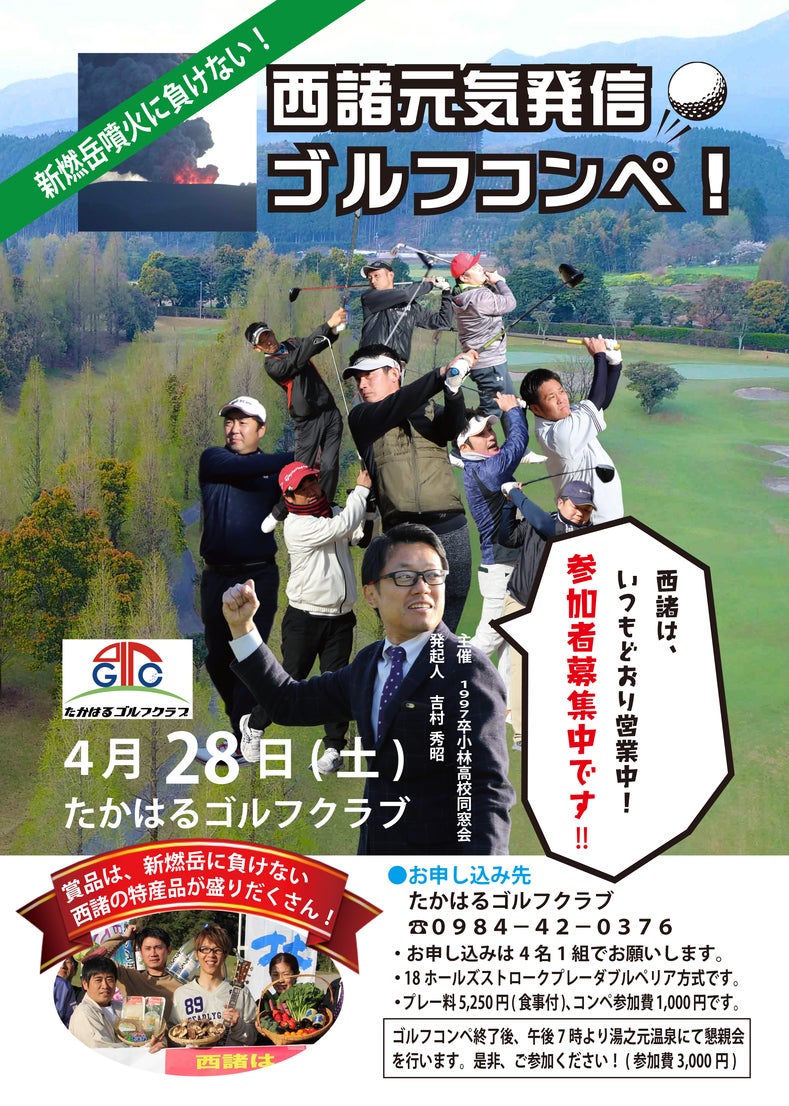 同窓会員であるたかはるゴルフクラブ専務 増田真人君から、今の西諸地域の観光・飲食業の現状を聞いた同窓会メンバーが、「じゃあ、西諸内外の人を集めて、楽しくゴルフしているのを発信して、西諸が元気に営業しているのを発信しよう!」と同窓会で呼びかけたのがきっかけです。