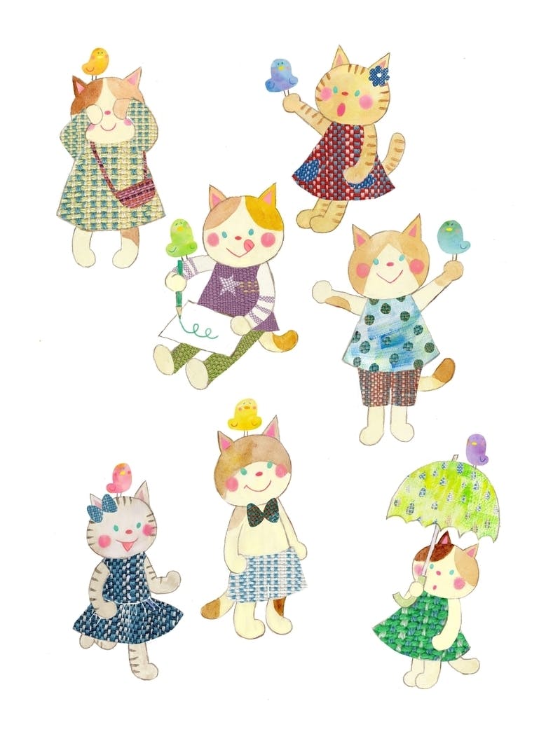 違う種類のトリとネコさんが仲良くしているというところにも思いを込めています。そして、ネコちゃんたちの着ている服も実はさをり織りで、全部違う柄なんです。
