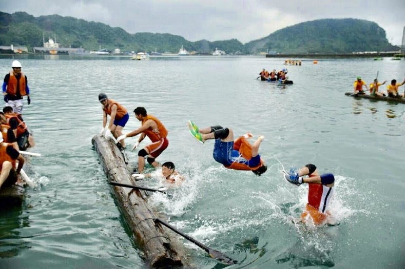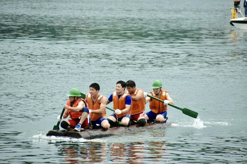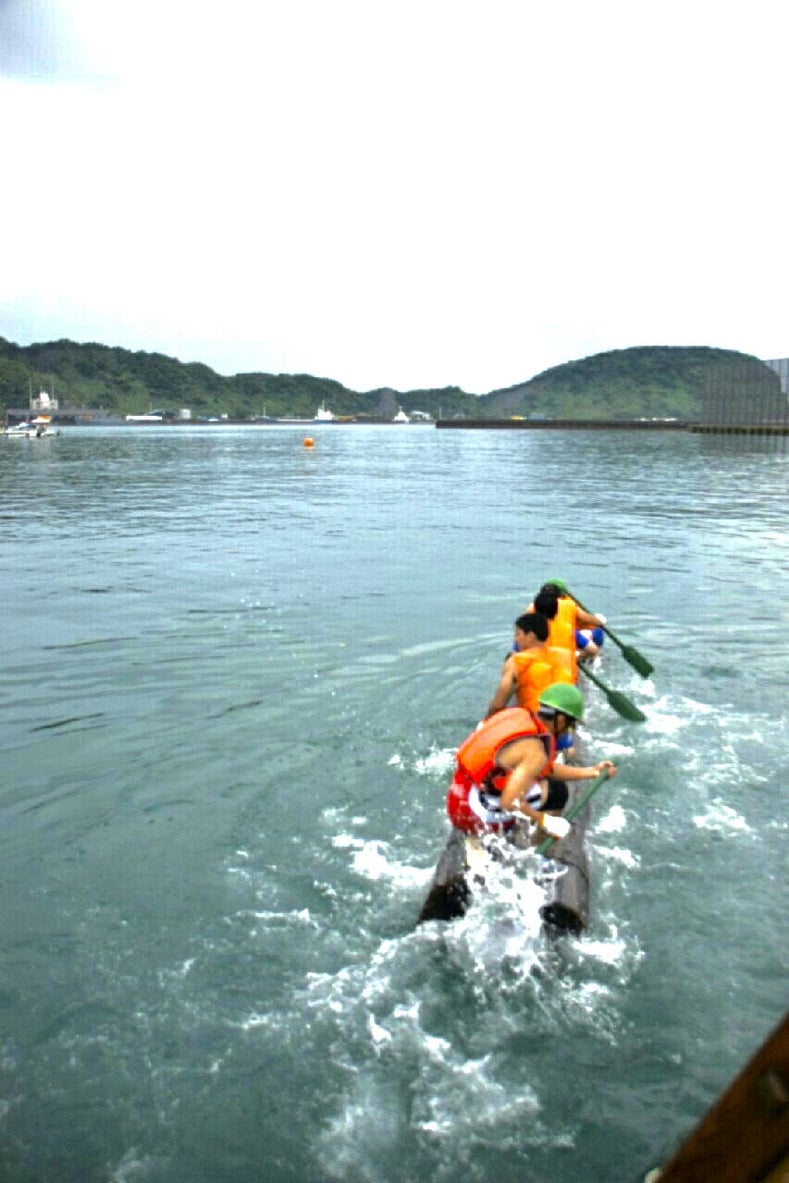 縛られた2本の飫肥杉に選手5名が搭乗し、オールを使い、港内を往復し、スピードを競う競技です。