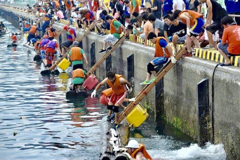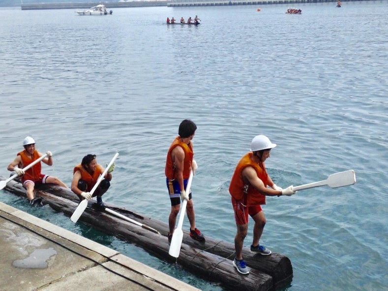 縛られた2本の飫肥杉に選手5名が搭乗し、オールを使い、港内を往復し、スピードを競う競技です。