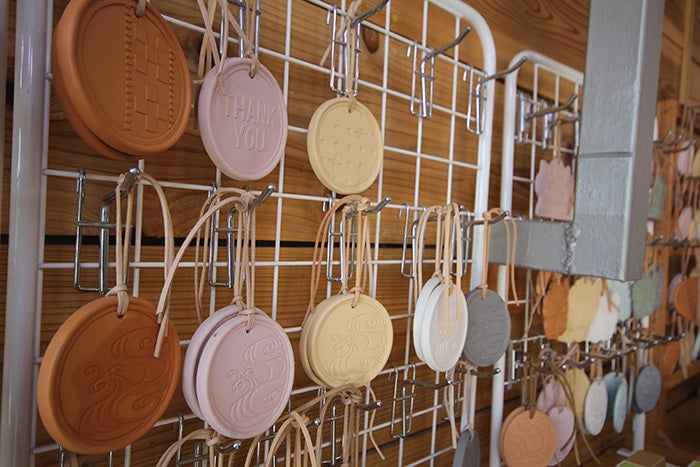 ▲首里城の瓦も実は与那原産。赤瓦を活かしたコースターやアロマスティック等かわいいグッズも沢山あります。