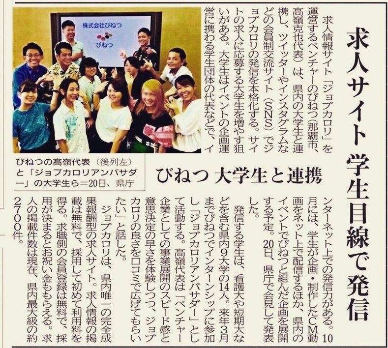 2018/08/27 10:598/20月曜日は、 株式会社びねつさんのが行っている成果報酬型求人サイトジョブカロリの 学生アンバサダーとして、記者会見に出させていただきました!これからCM動画の作成やSNSを活用して 広告活動を行っていきます! ジョブカロリは、企業さん側は掲載費無料、 採用になって初めてお金が発生する!登録者は採用が決まり働くとジョブカロリからお祝い金として5,000円がもらえる!というお互いいい条件でできるという 新しいサービスです! 記者会見でほんの少しですが実行委員も参加したので与那原イルミネーションの宣伝、クラウドファンディングの告知も させていただきました!これでたくさんの人に 知っていただけたらなと思います!また、この貴重な経験をさせて頂いたことに感謝を忘れず残り少ない 時間を頑張っていきます!! もっと見るラジオ