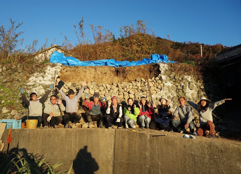 11,12月に外部から講師を招いて学習会と修復を行いました。石の積み方のコツが分かると夢中になって、みんなで力を合わせること自体が楽しみになり、2日かけて島の方々と「石垣のある景色」を復活させることができました。石垣の持ち主からは、「ご先祖様が喜んでいる!」と言っていただきました。後日、島のお兄さんは「さっそく自分の畑の石垣も直したよ」と。