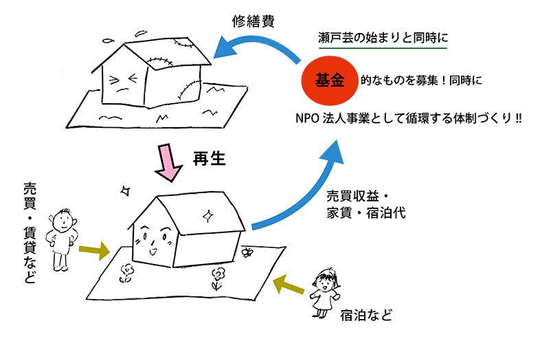 NPO法人で基金を募って、その基金を元に壊れかけの、誰も手をつけない家から直していきます。基金からは、材料費と作業の報酬が支払われます。直した空き家は、売却・賃貸・ゲストハウス・店舗などに活用し、その収益は次の危険空き家の修繕や新しい事業の展開や報酬につなげます。