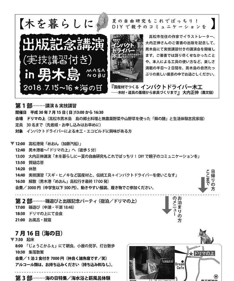 まず今回出した本『国産材でつくる インパクトドライバー木工』について、写真やイラストを見てもらいながらお話をします。日本の木材、スギ・ヒノキはとてもすばらしい素材で、それを工具をうまく使いこなすことで、暮らしの中に自作の木工作品を使っていく。その楽しみを、実例を紹介しながらお伝えしたい。そのあと、僕が道具の使い方を実演し、皆さんと共に実際に木で工作をします。できたものは持ち帰ってOKです。...