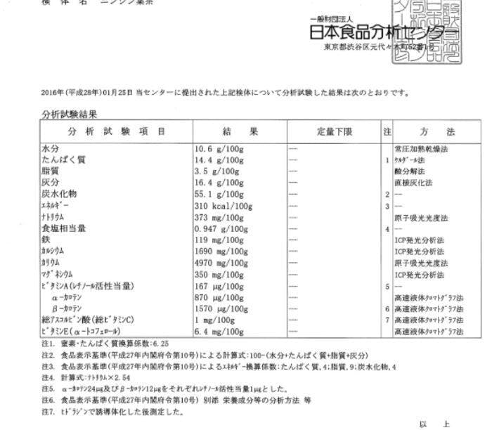 分析依頼した結果、ニンジン葉には抗酸化作用のあるビタミンCやEやカロチン、カルシウムやマグネシウム、カリウム等の必須ミネラル類が多く含まれていることがわかりました。