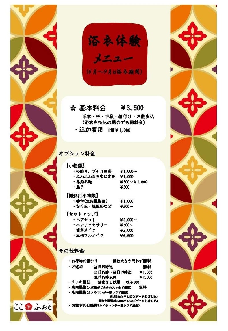 2018/08/10 15:41メニューや新しいプランができました! こんにちは!お久しぶりです。 ここふぉと担当の辻田です(/・ω・)/ 和装体験ここふぉとでのメニュー表が新しくなりました! 可愛らしく見やすいデザインにしました! チラシも新しくなりました! そしてなんと 夜のメニューも ナイトプラン、プラチナナイトプランができました! 明日、8月11日土曜日~8月14日火曜日まで お盆休みに入らせていただきます。 よろしくお願い致します。 お盆明けにnetOKを頂いた、お客様photoをアップしようかな~? と考え中です(*‘ω‘ *) ではでは、皆様ステキなお休みをお過ごしくださいませ˖° もっと見る