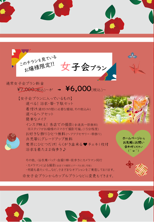基本料金コース3500円を3000円にて体験いただけます! (内容:浴衣・帯・下駄・着付け・お散歩)