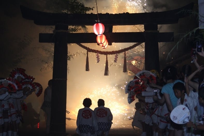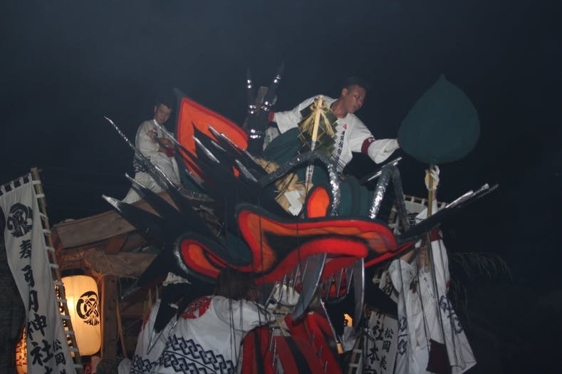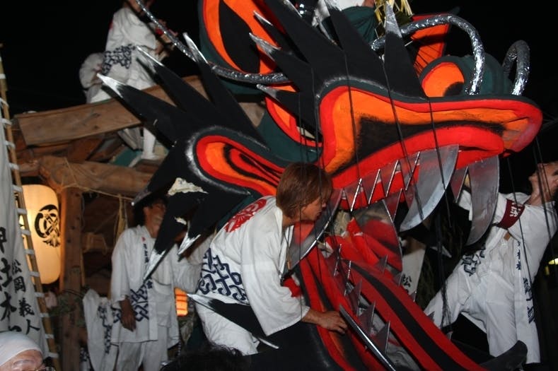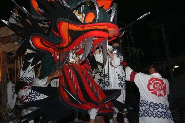 見どころは何と言っても、この勇壮な大蛇山。首を大きく振り、口から煙や火を吐きながらまちを練り歩く姿は、観る人を魅了し、感動させます。また、大蛇の口に子どもを入れて無病息災を願う「かませ」は、祇園六山に伝わる神事で、毎年多くの子ども達の健康を祈って行われています、(祇園六山以外の地域の大蛇山は「子ども健康祈願」と称しています)