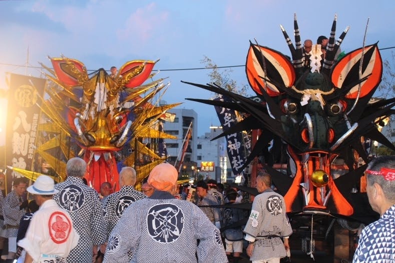 福岡県の最南端に位置する大牟田市では、毎年7月「海の日」前後から8月上旬までおおむた「大蛇山」まつりが開催されます。このおまつりは、それまで行われていた江戸時代が起源とされる「大蛇山祇園祭」、三池港周辺での「港まつり」、大牟田市商工界の「炭都まつり」が昭和36年に融合され、今年で57回目を迎える歴史と伝統のあるまつりです。(TOP画像は諏訪神社)