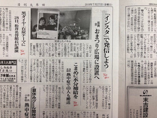 2018/07/27 18:12こんにちは! おおむた「大蛇山」まつり振興会です! 今日の朝刊に、インスタグラムのパネルについて 記事にしていただきました!! この記事を見て、少しでも多くの人が写真を撮りに 来てくれるといいなぁと思っています。 ライブ配信決定 振興会では、明日7月28日(土)の19:10~21:45までUstreamにて 「祇園六山巡行・競演・御止」のインターネット配信を決定しました!! ライブビューイングで上映してくださるお店様や施設様大歓迎! 朝から、報道発表と、インスタグラムでの発表も行いました。 このプロジェクトを見て頂いてる皆さまも お時間があったら、覗いてみて下さい! 大蛇山の魅力を伝えます!! ついに、明日から本番です。 台風の影響が心配されますが、無事開催する事が出来ればいいなと思います。 最後まで頑張りますので、よろしくお願い致します!! もっと見る