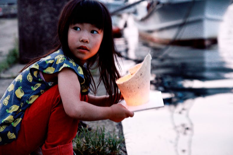 小学生一人ひとりが家族や先祖への感謝の想いを書いてもらい、その想いをのせた灯ろうが江の川に浮かびます。
