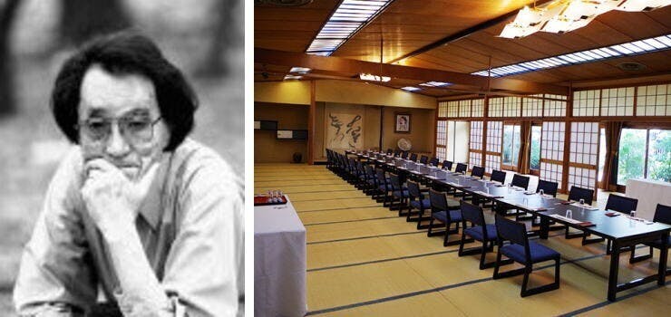 ▲石田種生と彼の生家<仁万屋>の大広間。<仁万屋>は惜しくもこの夏、約180年の歴史に幕を閉じた。