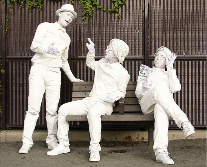 ↑ベンチを使ったパフォーマンス by 真っ白彫刻人間集団