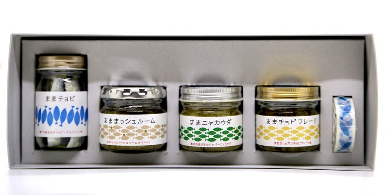 ・ままチョビ、まままっシュルーム、ままニャカウダ、ままチョビフレーク、ままマスキングテープの5種類を詰め合わせた、岡山特産のままかりづくめのセットを1つお送りします。